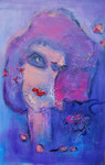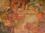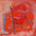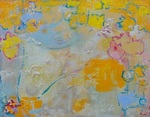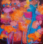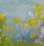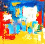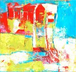 2004hout, textiel en acryl op paneel. door gebruik van verschillende materialen wordt het contrast tussen gebouwen en bomen benadrukt.